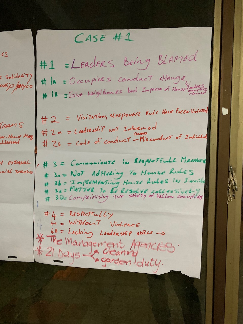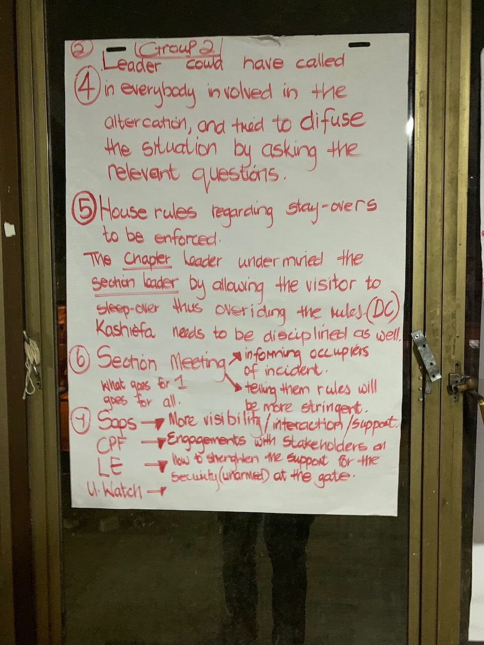 Safety issues: The workshop addressed issues that have become a threat to safety in the occupation, undermined the role of leadership and violated the RTC Cissie Gool House Rules. The nature of these issues is related to misconduct of individuals or groups and has led to gender – based violence, gambling, drugs and alcohol abuse which also involves youth, noise and disturbance and violation of visitation and sleepover rules.